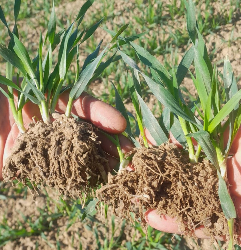 Note the rhizosheat on the coated plants (left) compared to control (right).